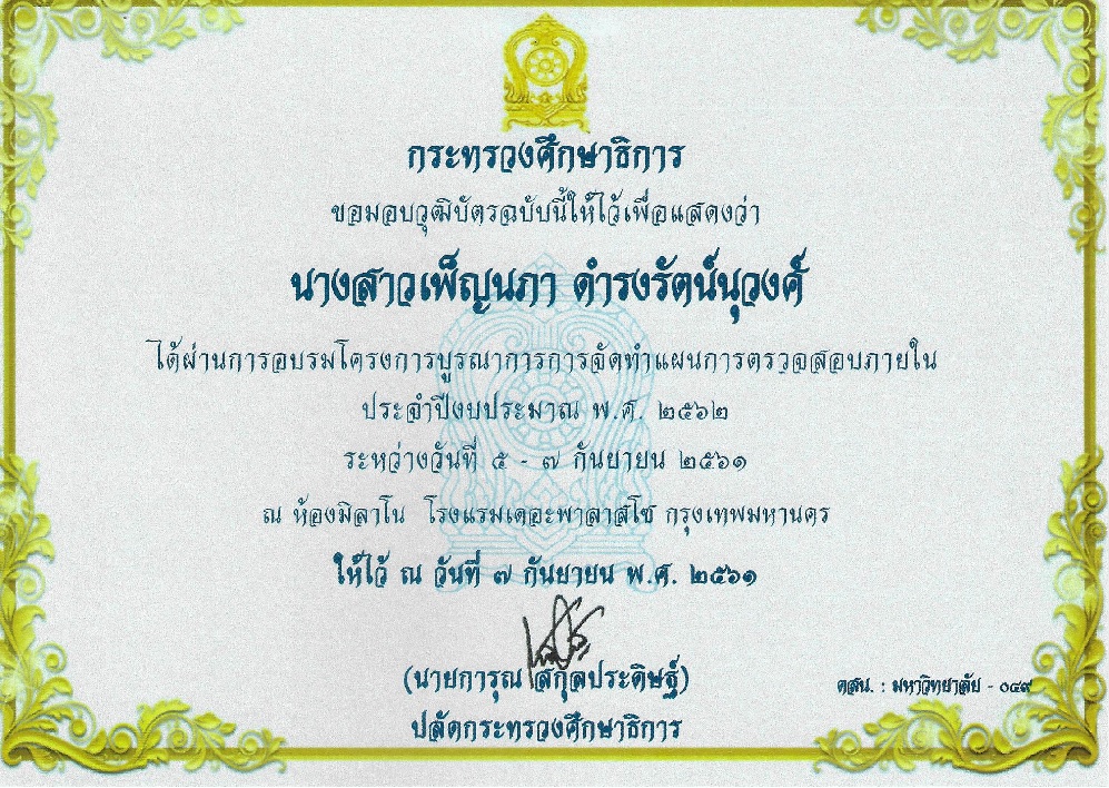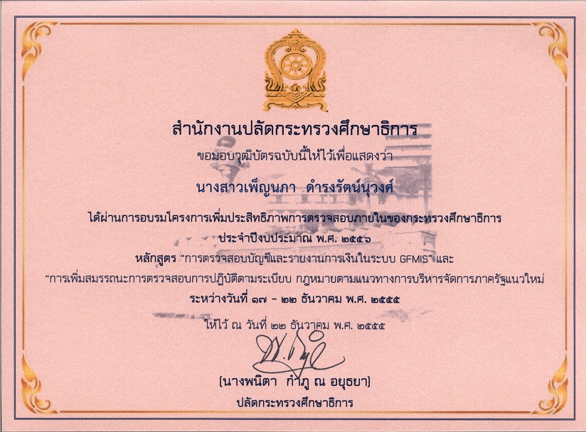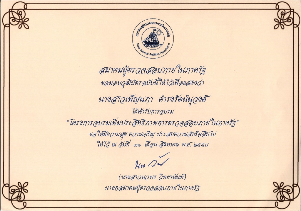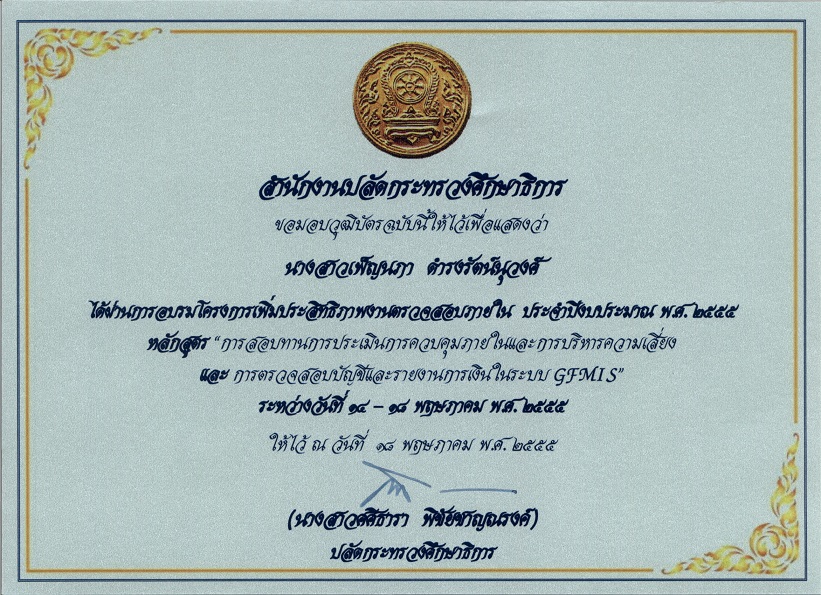 - หลักสูตร "การสอบทานการประเมินการควบคุมภายในและการบริหารความเสี่ยง และการตรวจสอบบัญชีและรายงานการเงินในระบบ GFMIS. พ.ศ. 2555