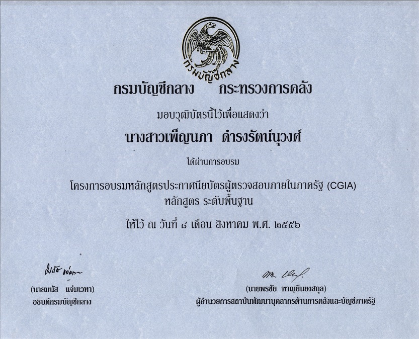 - หลักสูตรประกาศนียบัตรผู้ตรวจสอบภายในภาครัฐ(CGIA) หลักสุตร Intermediate Finance and Compliance