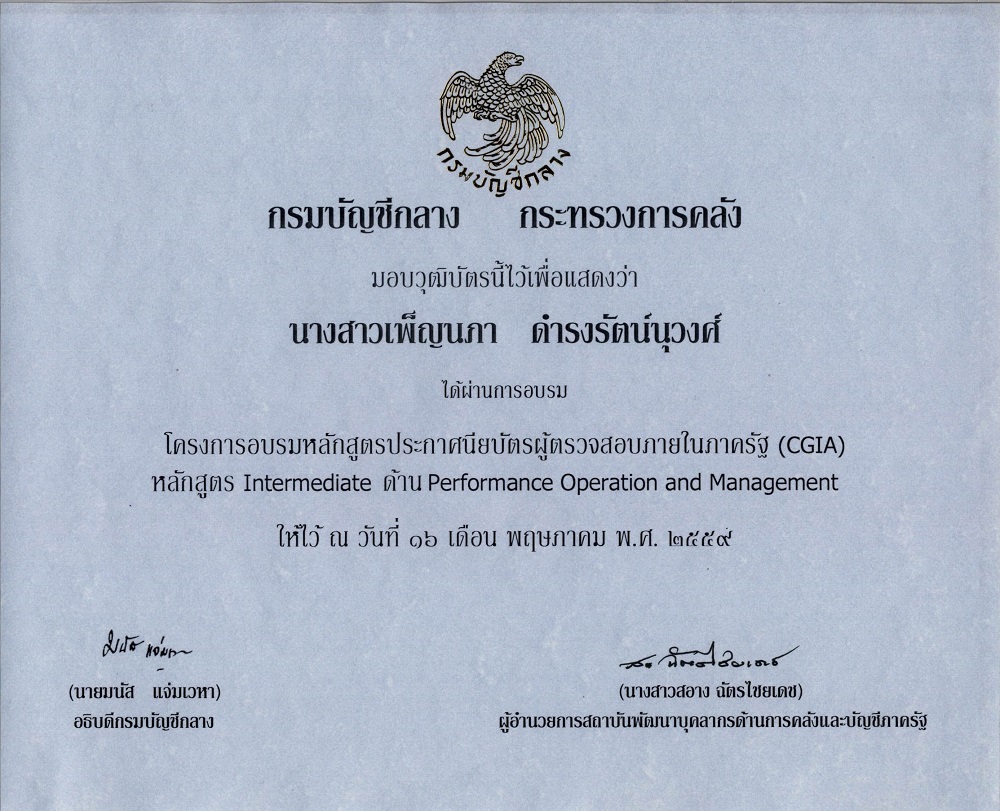 - หลักสูตรประกาศนียบัตรผู้ตรวจสอบภายในภาครัฐ(CGIA) หลักสูตร Intermediate Performance Operation and Manangement
